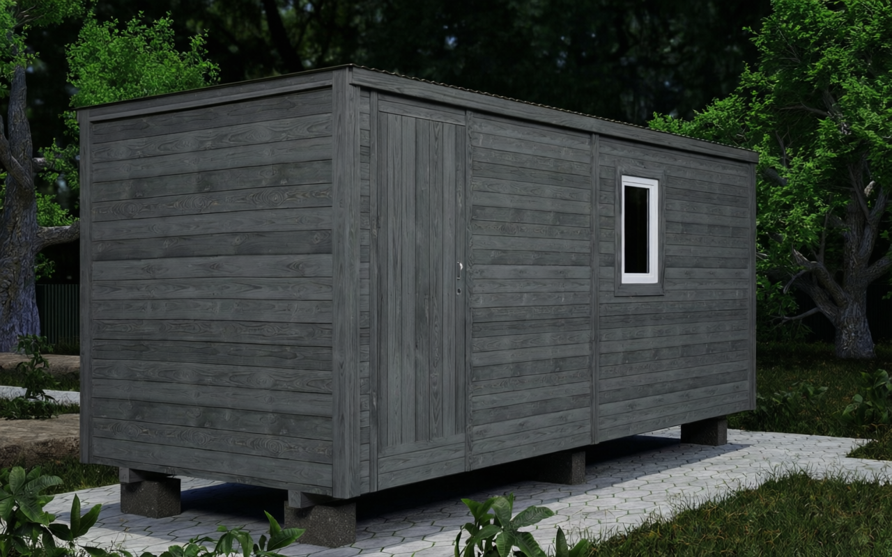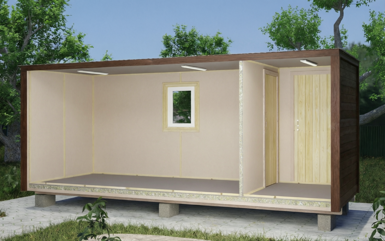 Дачная бытовка 6 метров с выделенным тамбуром — практичное решение для круглогодичного проживания. Тамбур отсекает холодный воздух и служит прихожей, сохраняя тепло в жилом помещении. Каркас из хвойного бруса 100×50 мм, утепление минватой 50 мм, наружная отделка деревянной вагонкой класса С, кровля из оцинкованного профлиста.